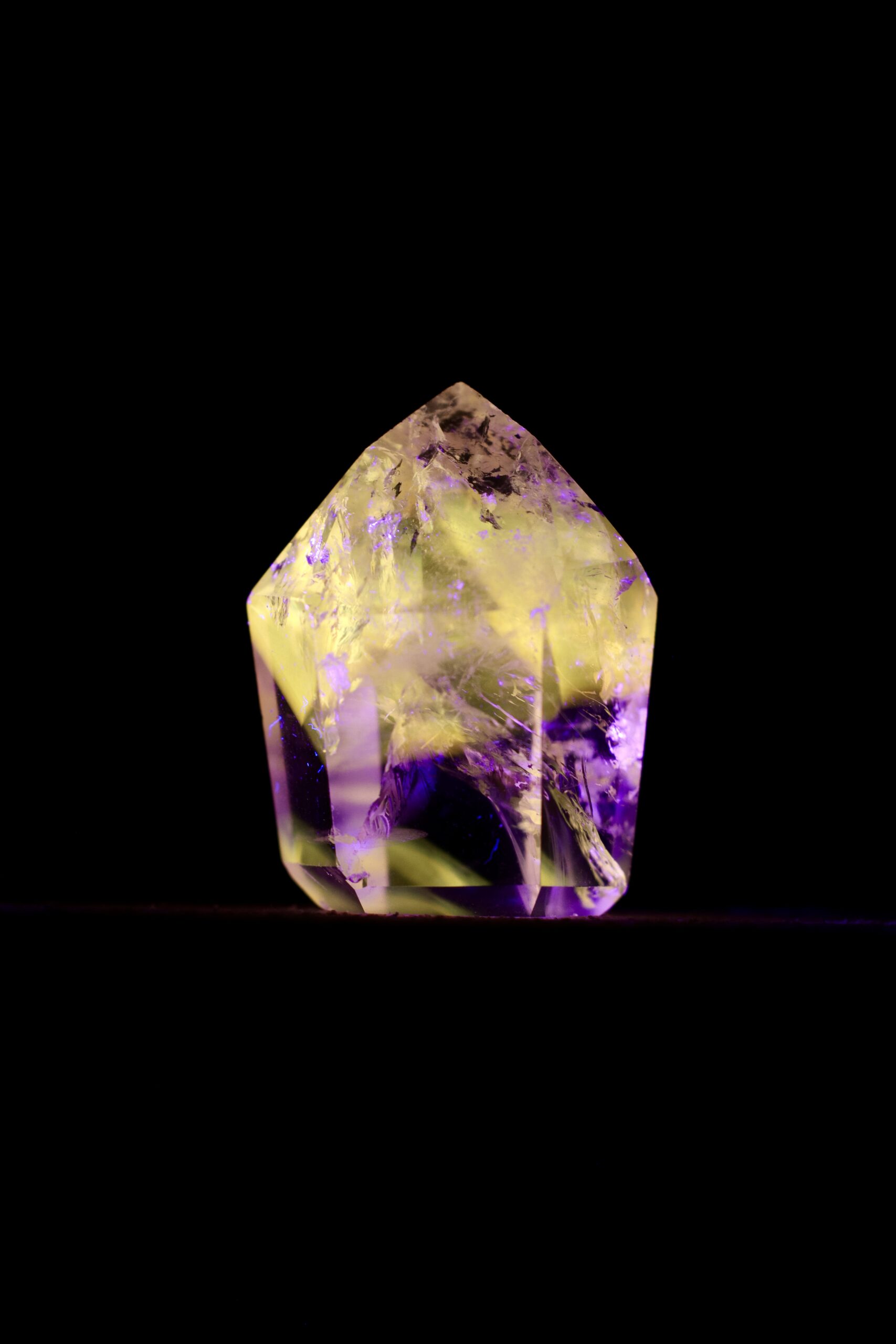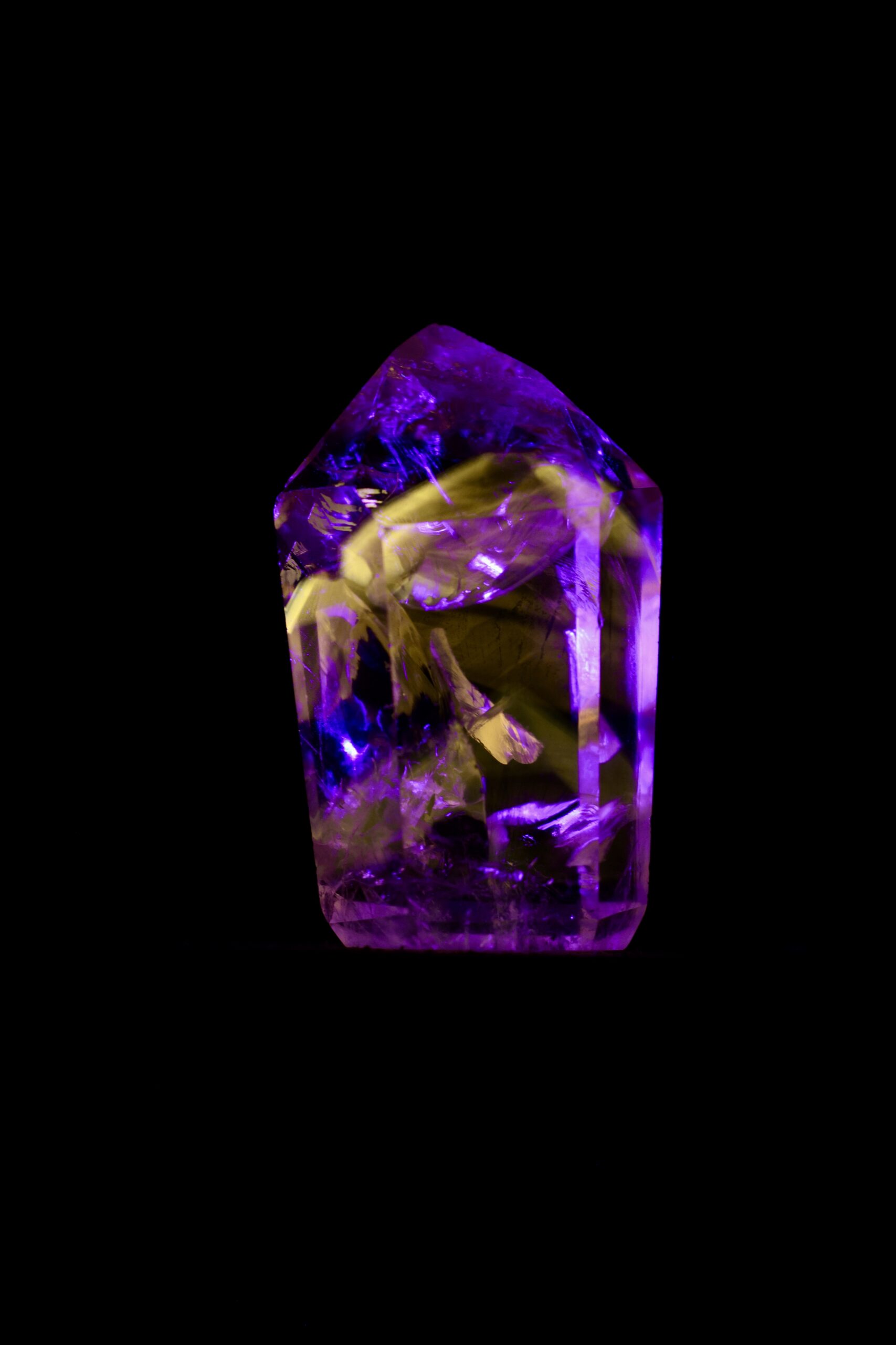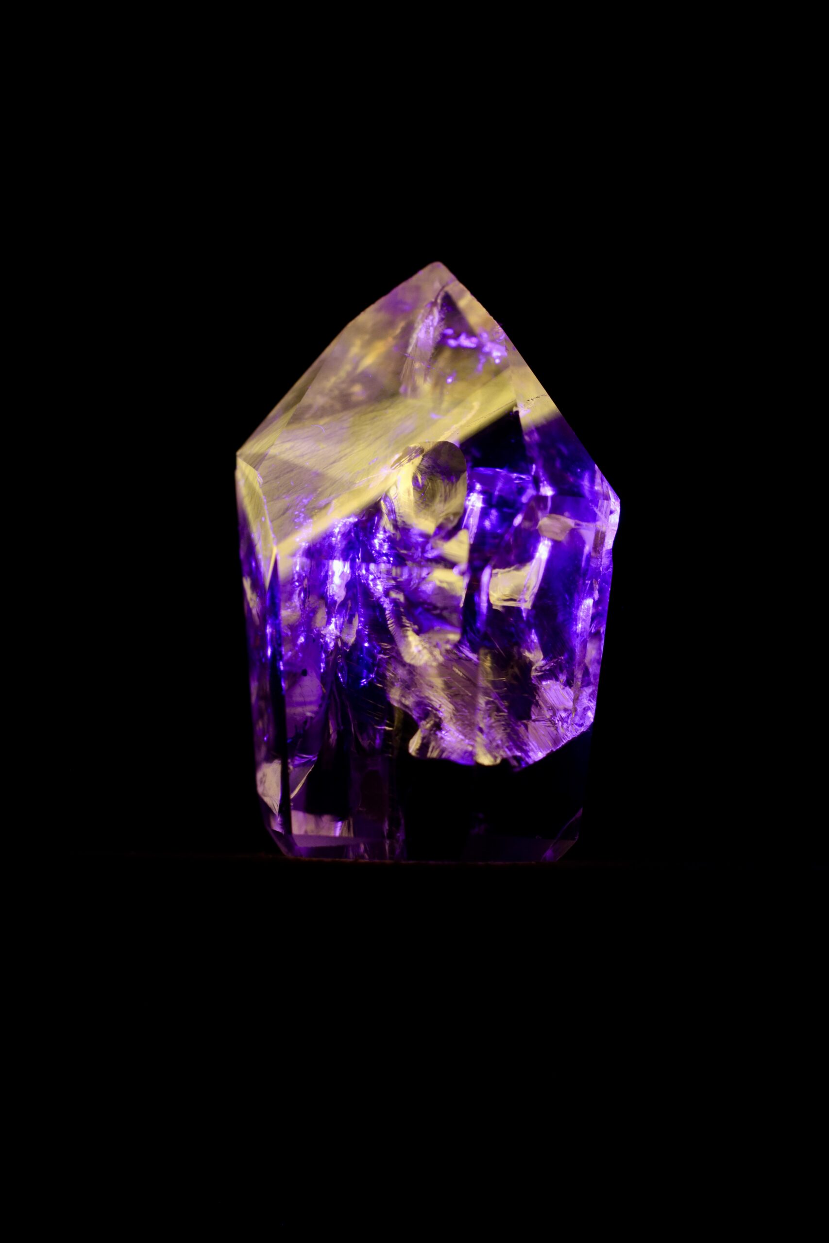 Nos casos em que a Powellita está associada ao Quartzo de Ametista, essa característica se torna ainda mais interessante. O Quartzo, em si, geralmente não apresenta fluorescência significativa, e a Ametista mantém sua coloração violeta sob luz visível. Já a Powellita, quando presente nesse mesmo conjunto, responde à luz UV de forma ativa — revelando sua presença de maneira quase oculta, como se emergisse apenas sob uma condição específica de iluminação.