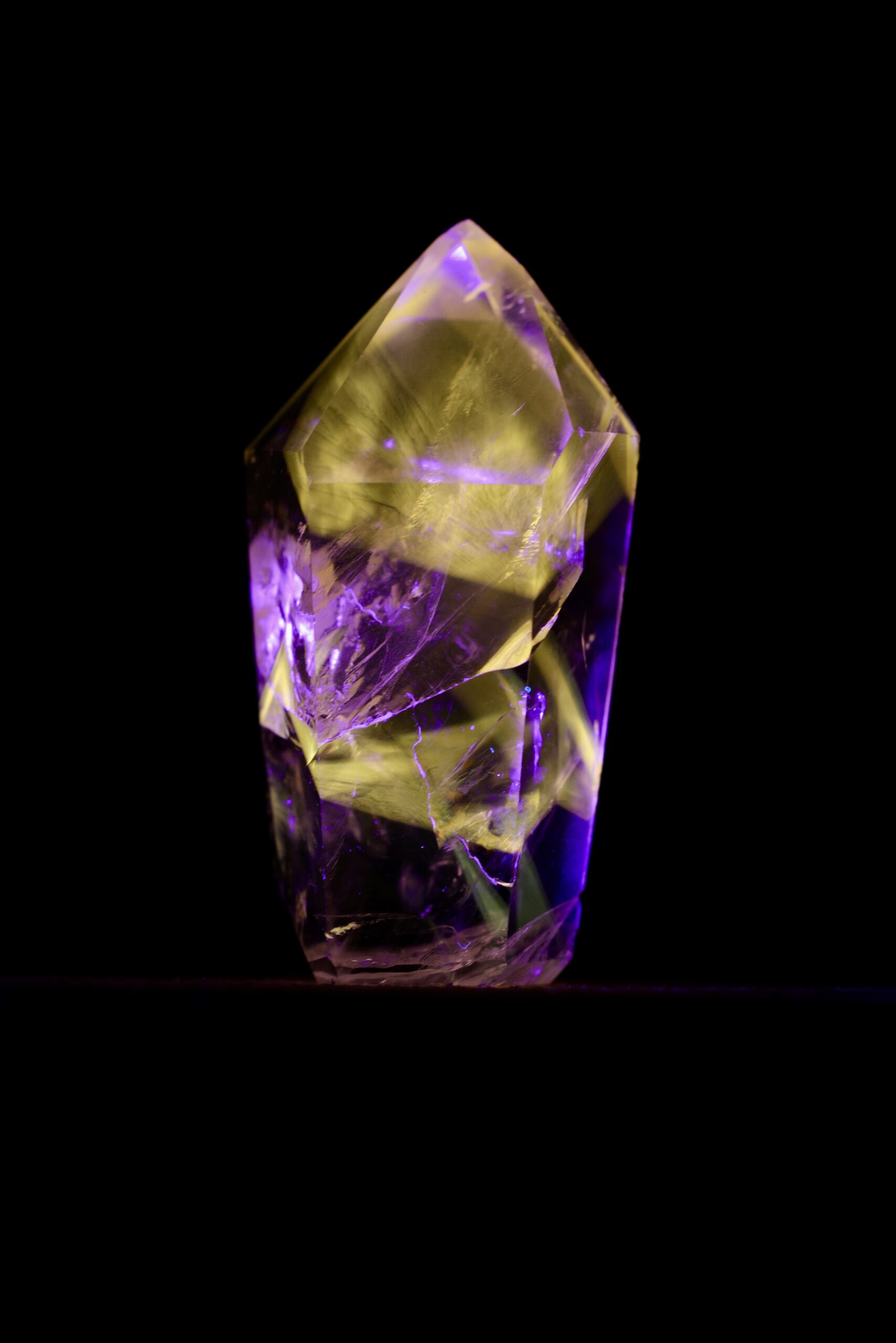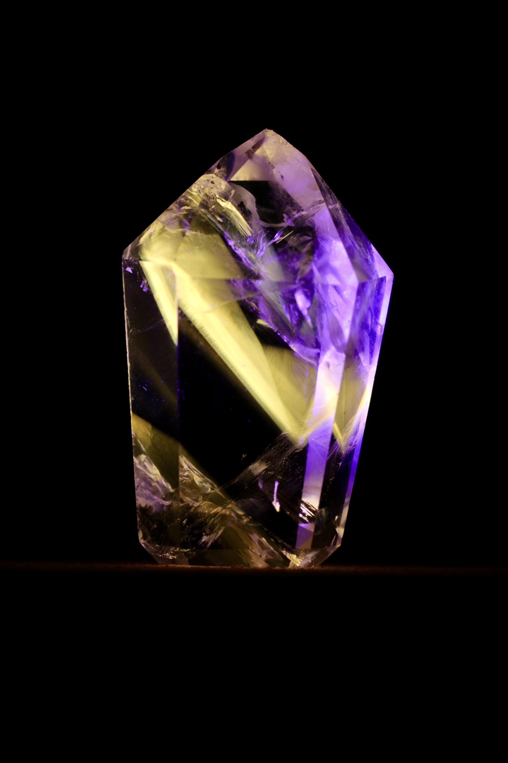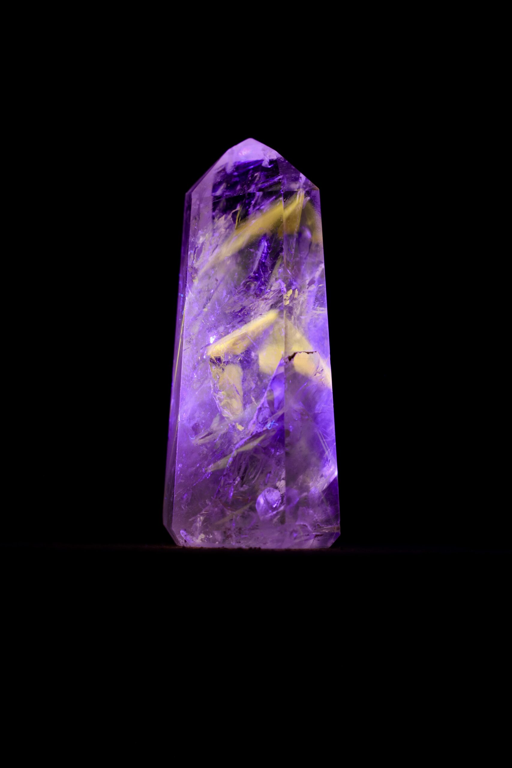 Nos casos em que a Powellita está associada ao Quartzo de Ametista, essa característica se torna ainda mais interessante. O Quartzo, em si, geralmente não apresenta fluorescência significativa, e a Ametista mantém sua coloração violeta sob luz visível. Já a Powellita, quando presente nesse mesmo conjunto, responde à luz UV de forma ativa — revelando sua presença de maneira quase oculta, como se emergisse apenas sob uma condição específica de iluminação.